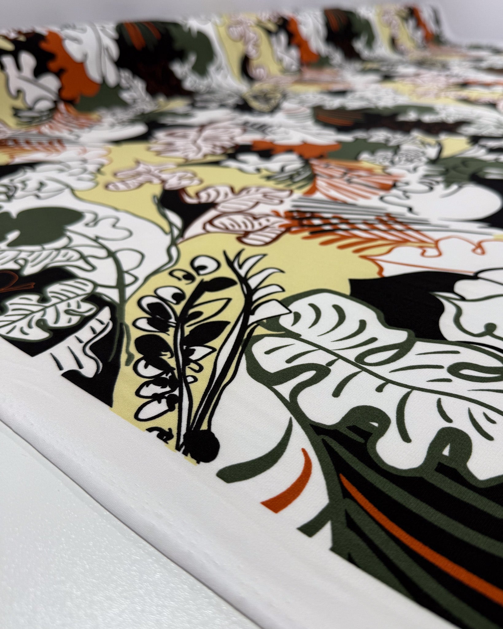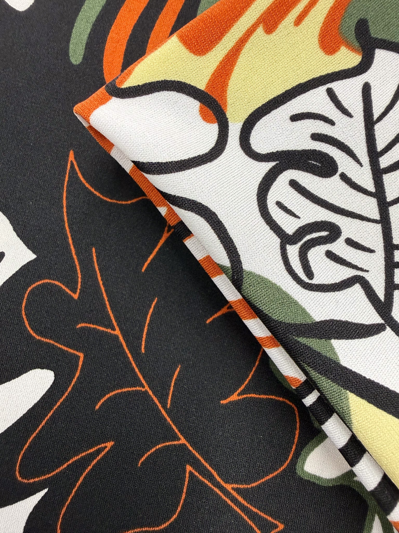 Our Printed Lycra is a Polyester/Spandex fabric that has a two-way stretch and comes in a variety of beautiful prints! Printed Lycra is a medium-weight fabric, has good durability and stretch, and washes well. Our Lycras are perfect for making tops, dresses, skirts, pants, accessories, and even childrenswear. This vibrant botanical print features oversized tropical leaves layered in a bold, graphic composition.