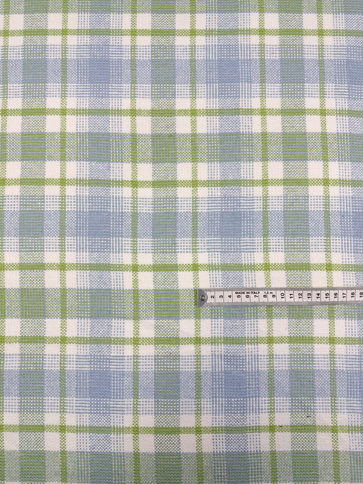 A textured weave pure linen in crisp green and blue. A fresh lime & blue linen check.