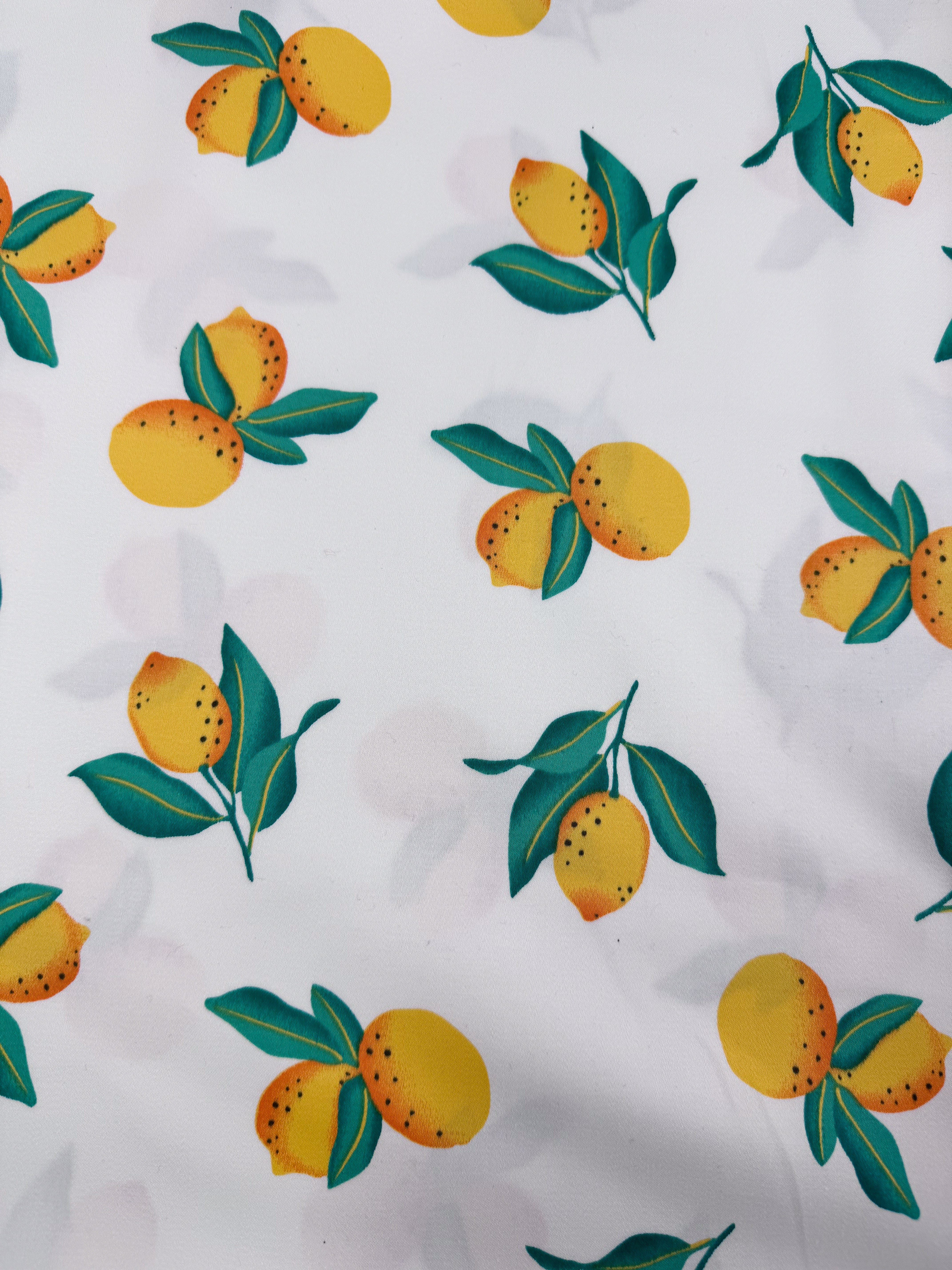 Super Cheap Fabrics’ Cotton Sateen - Lemon Grove (145cm) features white cotton fabric with a lively multi-colour pattern of yellow lemons and green leaves scattered across the surface.