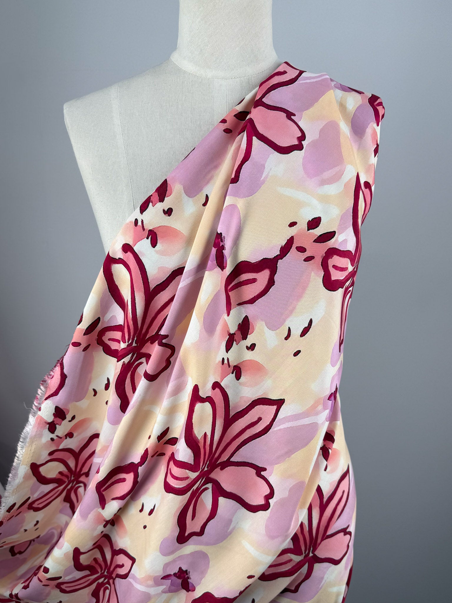 Our Designer Rayon showcases a beautiful and colourful fabric with vibrant prints that can be used for various purposes such as dresses, skirts, blouses, curtains, and more. Our collection showcases a soft, lightweight fabric with a smooth drape and a luxurious feel. Overall, rayon fabric offers both comfort and style, making it a versatile choice for any project. Rosewater features painterly floral motifs in soft blush and lilac tones, outlined in rich raspberry over a gentle cream base.