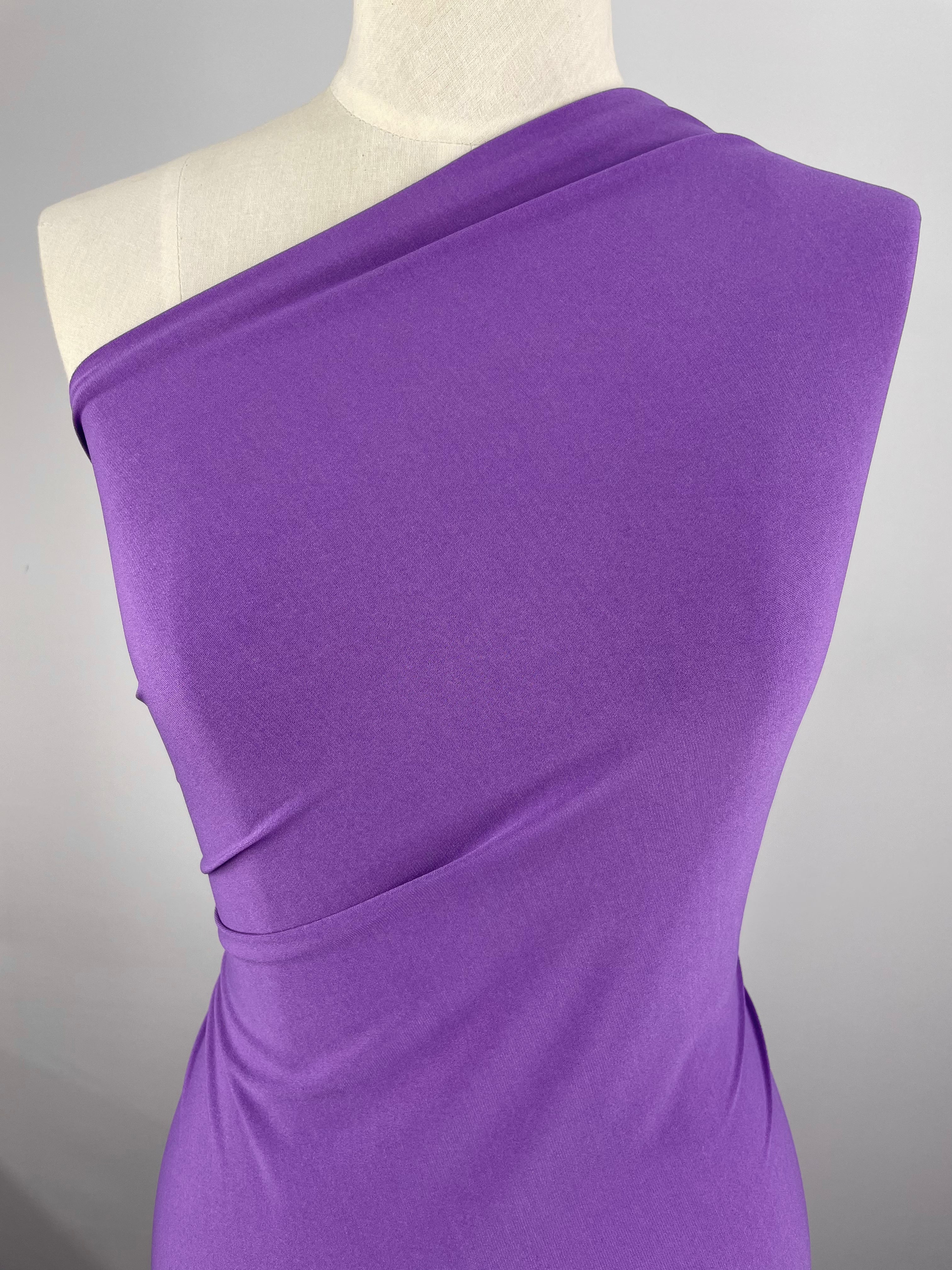 A mannequin draped in a vibrant Super Cheap Fabrics' ITY Knit - Royal Lilac - 150cm, one-shoulder, medium-weight fabric. The fabric is smoothly wrapped around the upper torso, creating elegant folds and highlighting the body's natural shape. The background is plain and neutral, emphasizing the garment's rich color.