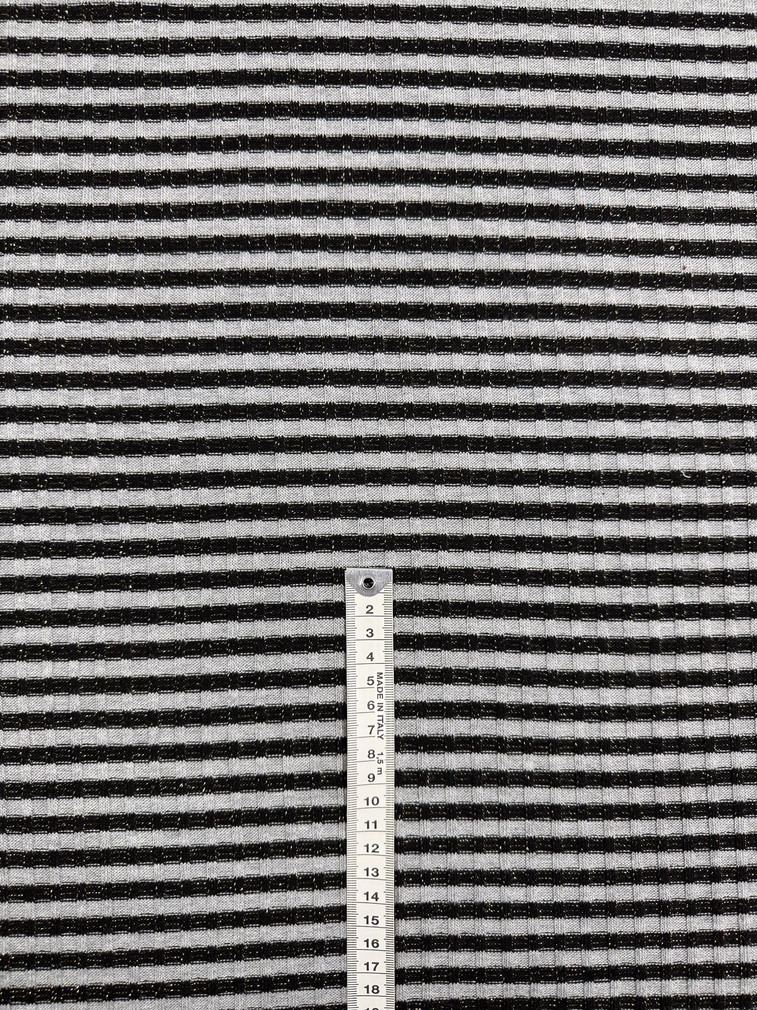 A black and white striped lurex knit fabric with fine metallic (lurex) threading.