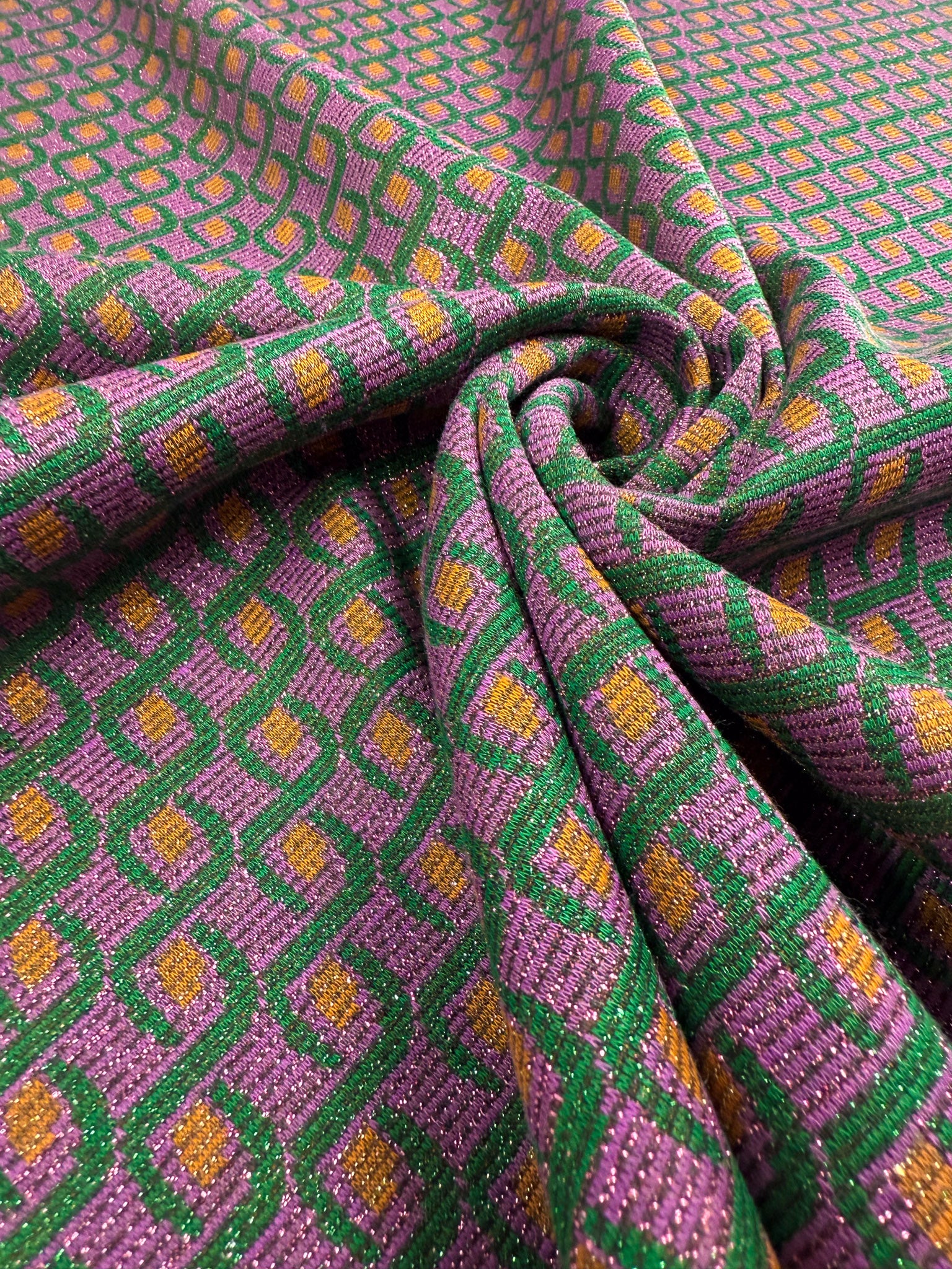 A lurex knit fabric with a geometric pattern in purple, green, and gold with a luxe woven texture.