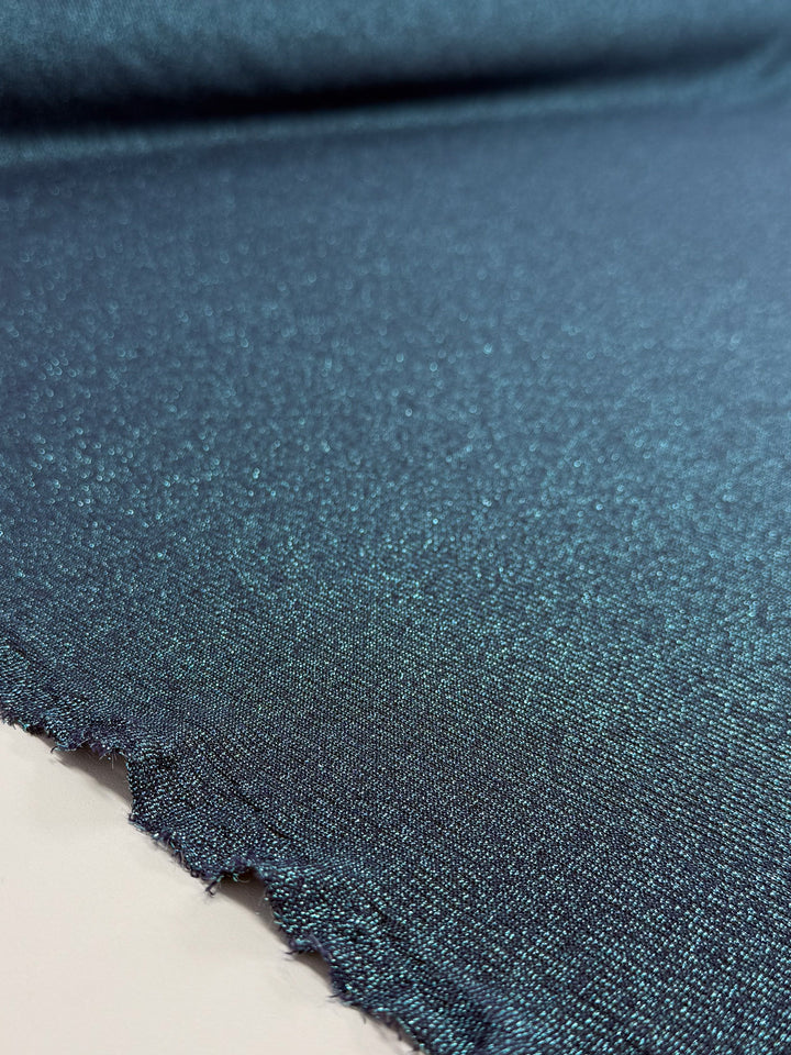 A shimmering teal viscose, lurex knit fabric with subtle metallic depth.