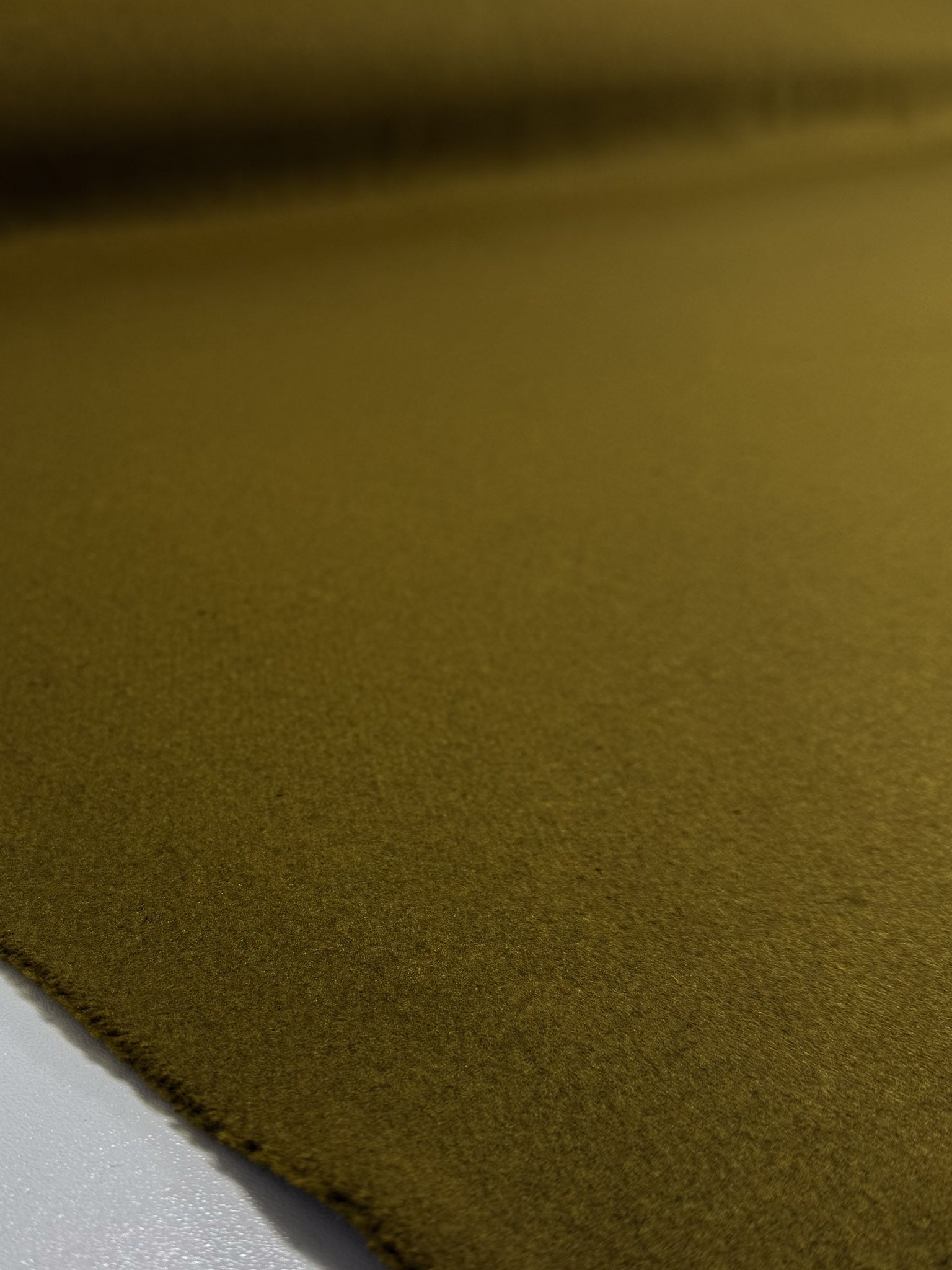 A close-up of Super Cheap Fabrics’ Wool Cashmere - Plantation (155cm) in olive green, a medium-heavy fabric with a soft, fuzzy texture, laid flat on white. The slightly uneven edge is visible in the foreground.