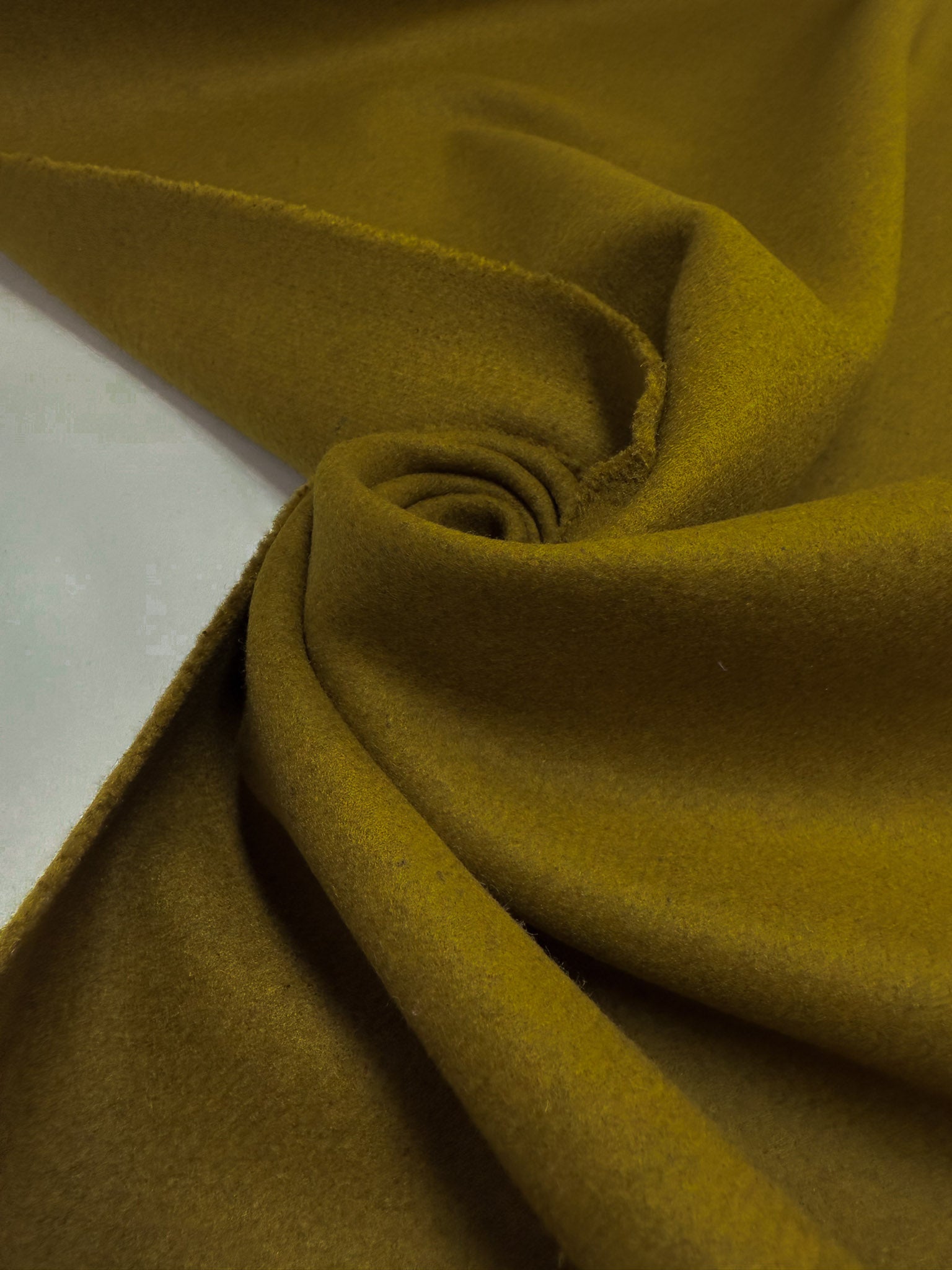 A close-up of Super Cheap Fabrics' Wool Cashmere - Plantation (155cm) in mustard yellow, arranged in soft folds and a swirl pattern to highlight its smooth, slightly textured surface.